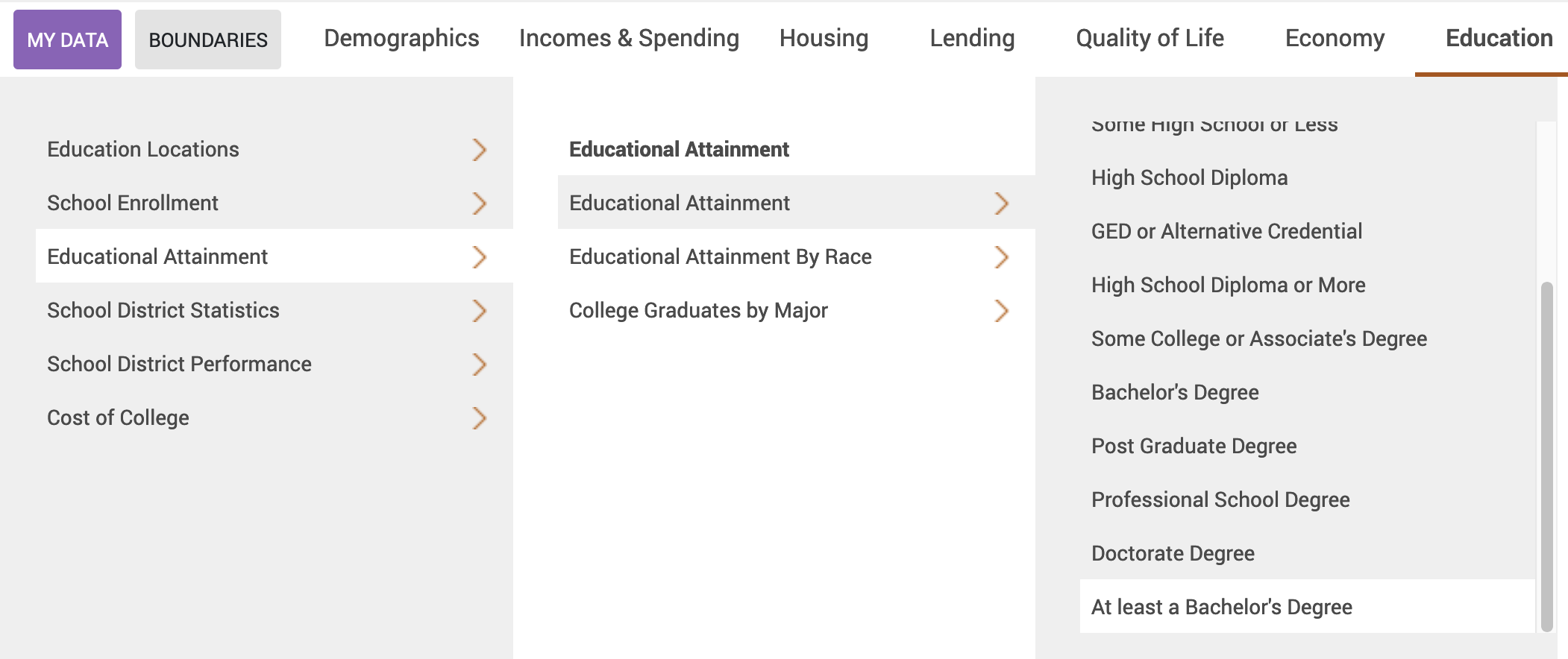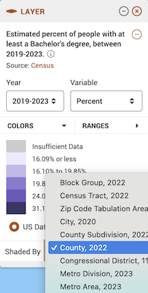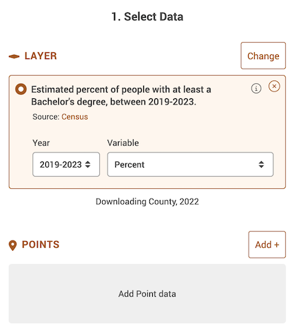 A window should pop up. The first screen on the left shows you what data will be downloaded - it should be “Estimated percent of people with at least a Bachelor’s degree, between 2019-2023” under Layer, with “2019-2023” under Year and “Percent” under Variable already selected.