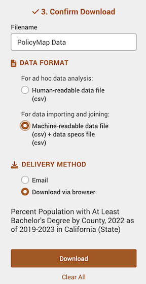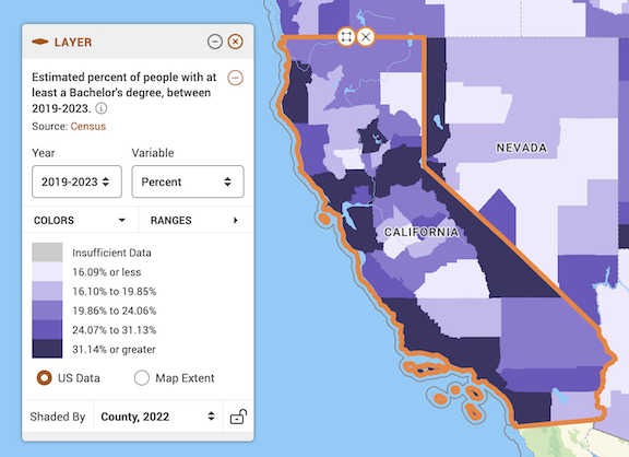 UC Davis provides full access to all PolicyMap tools for staff, students, and faculty. The following sections provide step-by-step instructions for downloading data from PolicyMap and reading it into R. We will be downloading the percent of residents with a bachelor’s degree in California counties from the 2019-2023 American Community Survey.