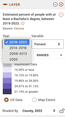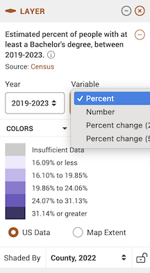 Leave the defaults (Year: 2019-2023, Variable: Percent, and Shaded by: County, 2022). County, 2022 indicates that you want to show the data by county using 2022 county boundaries.