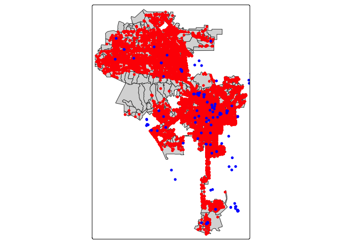 Now, let’s map shelters (in blue) and encampments (in red) on top of the tracts.