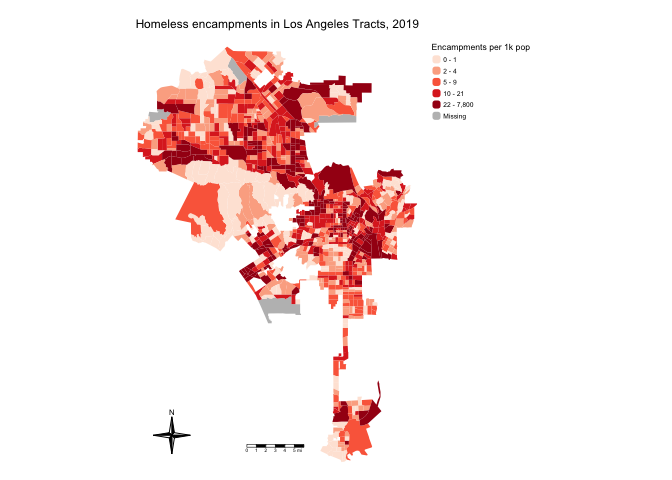 tm_title("Homeless encampments in Los Angeles Tracts, 2019") +