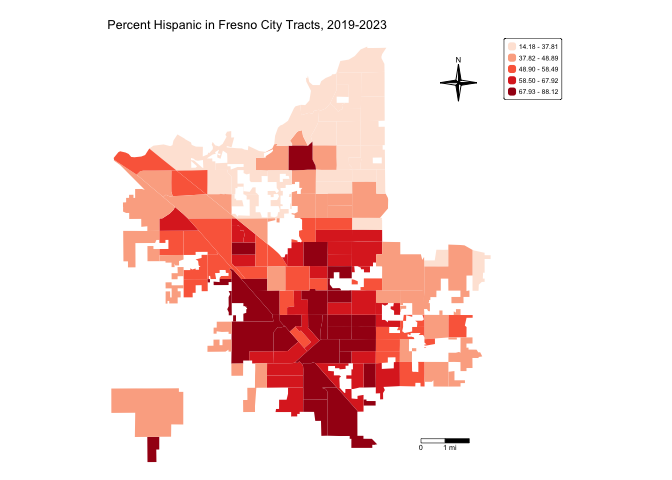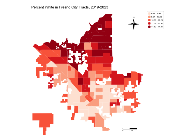 Looks much better. The Dissimilarity index for Black/White in Fresno is 0.468. The interpretation of this value is that 46.8% of Black residents would need to move neighborhoods in order to achieve a uniform distribution of Black and White residents across neighborhoods in the city.