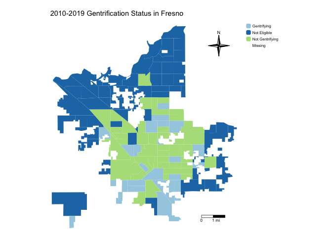 tm_title("2010-2019 Gentrification Status in Fresno") +