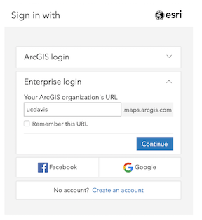 Navigate to the UC Davis ArcGIS Online splash page. I highly recommend you do not use Chrome. (Use Safari or Firefox)