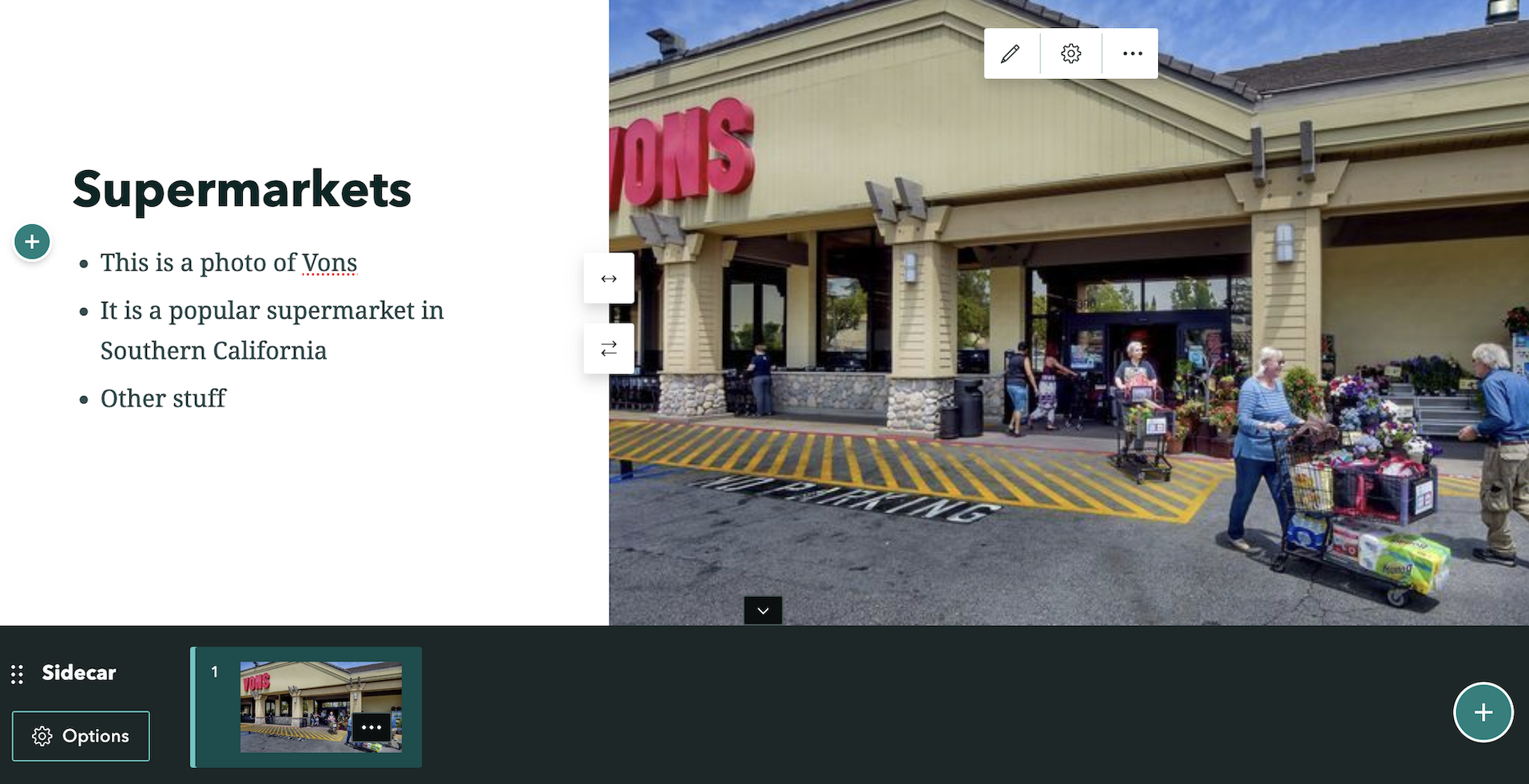 A sidecar is a particular StoryMap tool that allows the user to present their maps/images/text in an organized, visually appealing fashion. Alternatively, you can just simply add plain text and photos without them being in a feature.