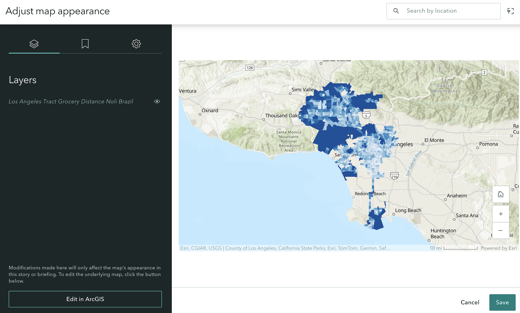(“Los Angeles Tract Distance to Nearest Grocery Store”). Add a tag (“Los