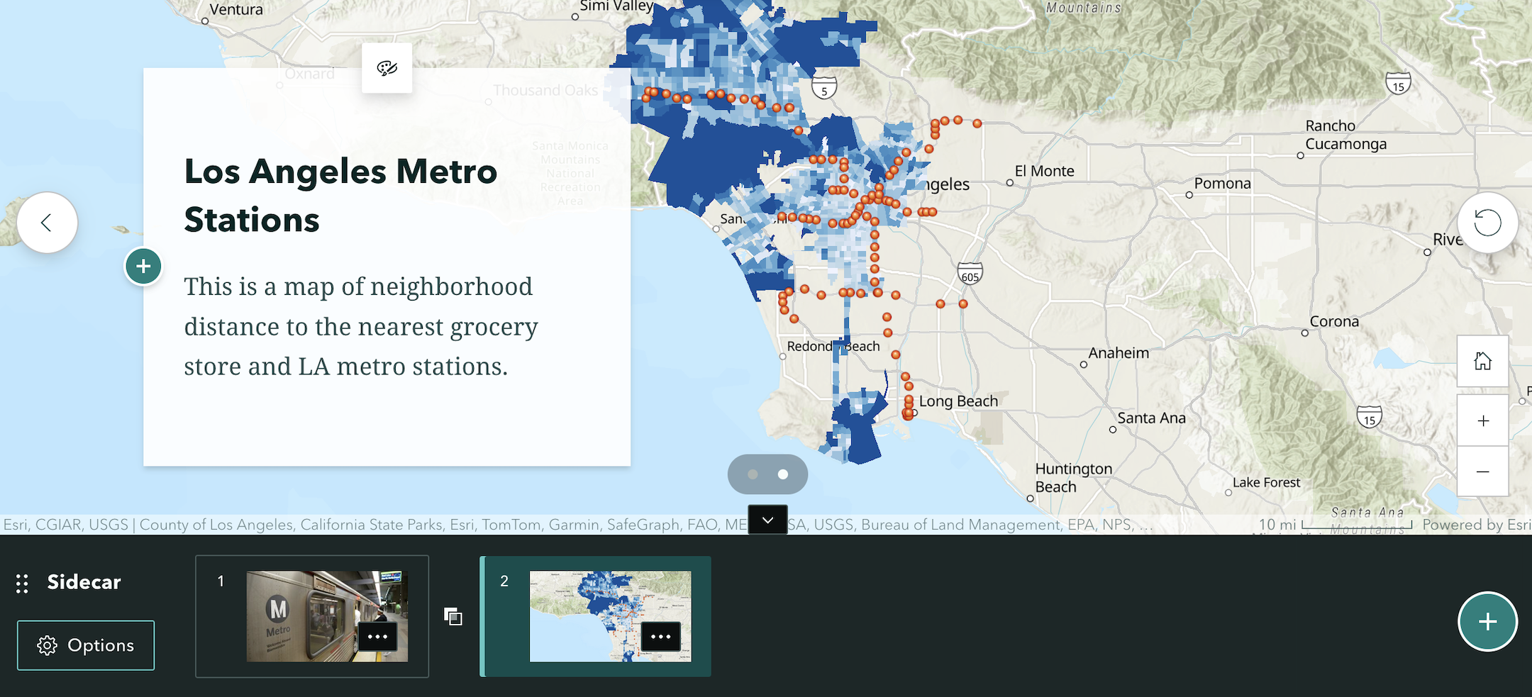 For this lab, download the files from Canvas (Files - Week 9 - Lab). There should be eight files - six photos (lametro.jpg, los_angeles_photo.jpg, pblk_histogram.jpg, phisp_histogram.jpg, stater_bros.jpg, and vons.jpg) and two zip files (la_tract_groc_dist and Los_Angeles_Metro_Stations). la_tract_groc_dist.shp is a shapefile of census tracts and the distance to their nearest grocery store in the City of Los Angeles. Los_Angeles_Metro_Stations.shp is a shapefile containing Los Angeles Metro Rail stops. We’ll create a StoryMap about grocery store spatial access in the City of Los Angeles.